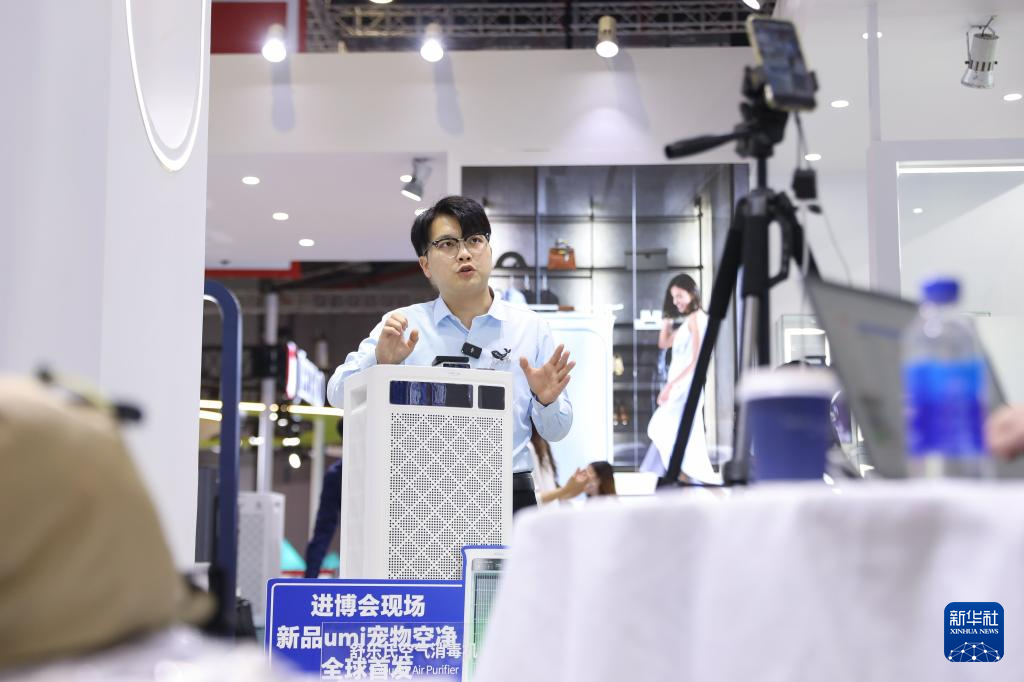 11月9日,参展商在第七届进博会舒乐氏展台直播推介商品。舒乐氏今年首次参展进博会。