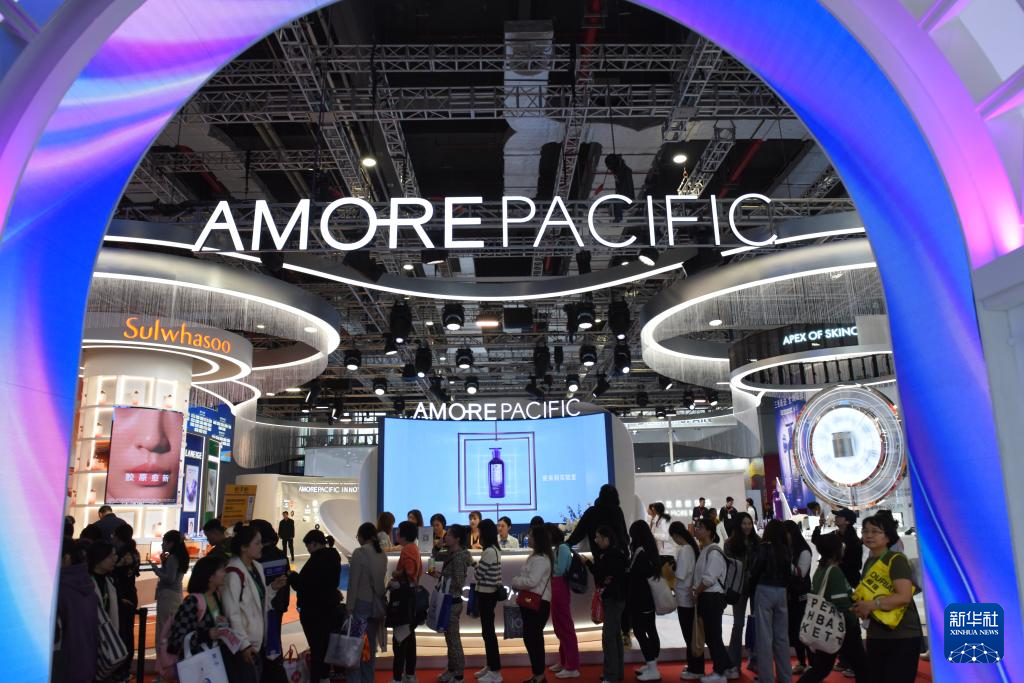 这是11月9日在第七届进博会拍摄的爱茉莉太平洋展台。爱茉莉太平洋是进博会七届“全勤生”。