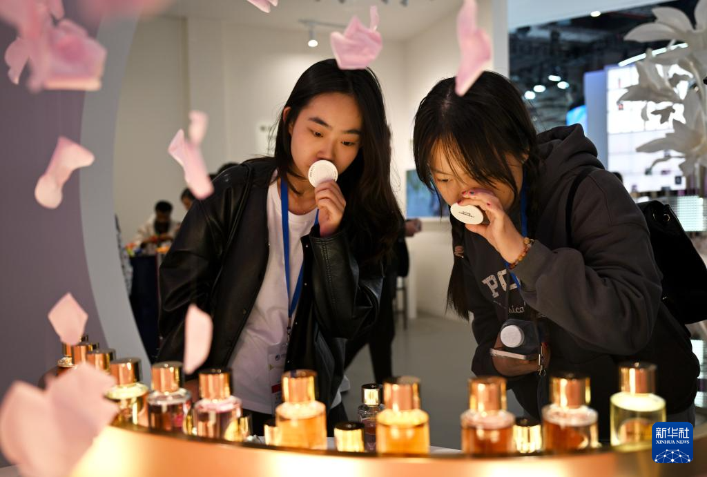 11月9日,观众在第七届进博会欧莱雅展台试闻香水。欧莱雅是进博会七届“全勤生”。