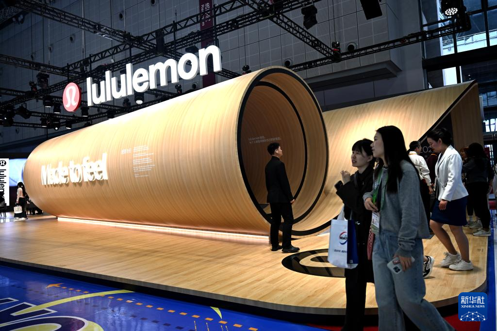 11月9日,观众走过第七届进博会露露乐蒙展台。露露乐蒙今年首次参展进博会。