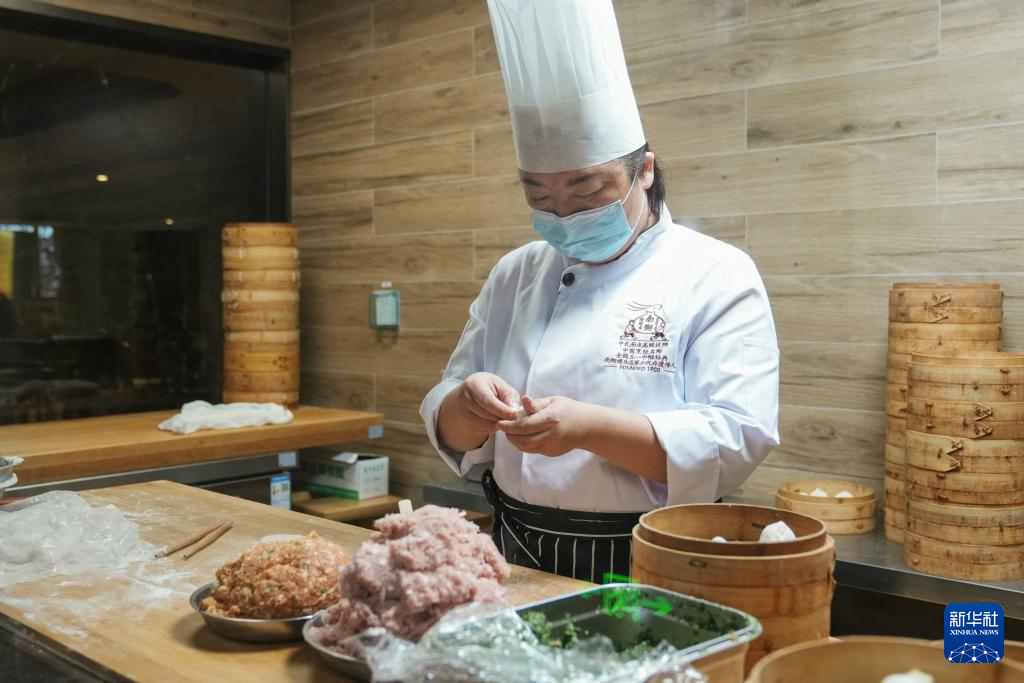 11月4日,在上海豫园南翔馒头店,厨师长游玉敏(中)在包制小笼馒头。