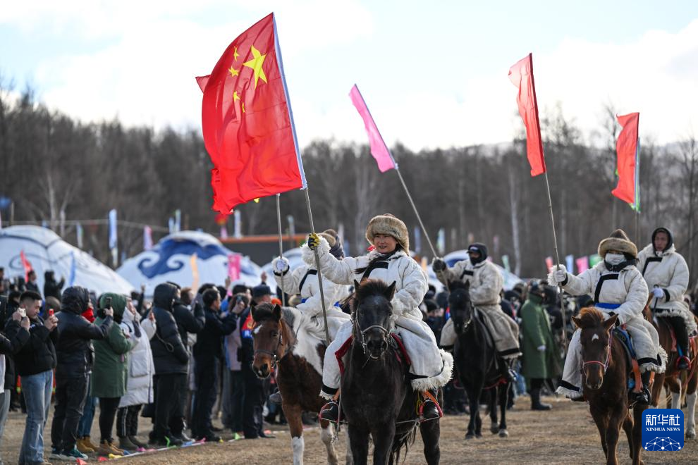 11月10日,守边牧民在冰雪那达慕上入场。