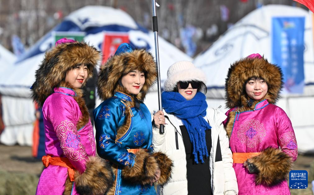 11月10日,游客(右二)在冰雪那达慕上与演员合影。