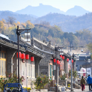 游客在北京市怀柔区慕田峪长城脚下的渤海镇北沟村游玩(10月29日摄)。