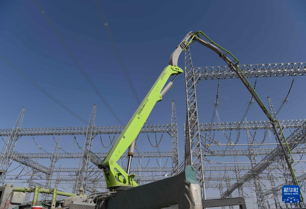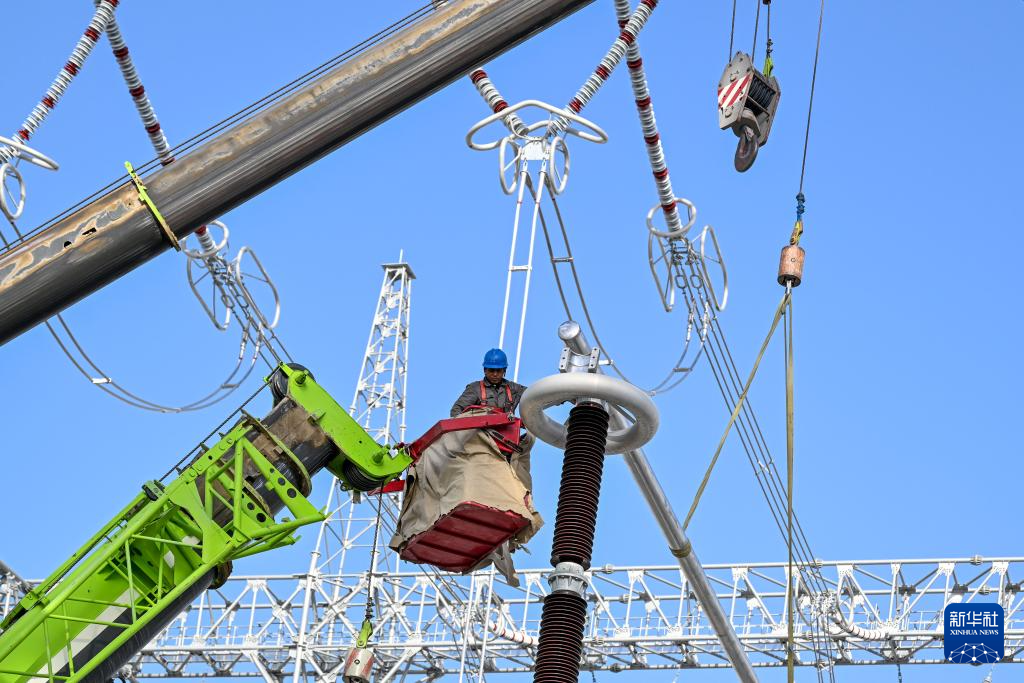 工人在新疆民丰750千伏变电站施工现场作业(11月10日摄)。