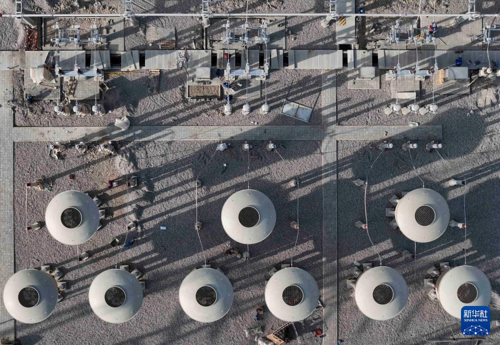 工人在新疆民丰750千伏变电站施工现场作业(无人机照片,11月10日摄)。