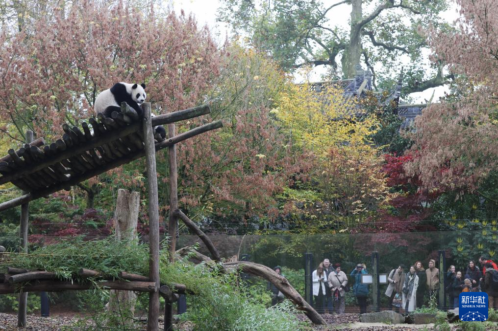 11月10日,在位于比利时布吕热莱特的天堂动物园,人们观看大熊猫“宝弟”和“宝妹”(上)。