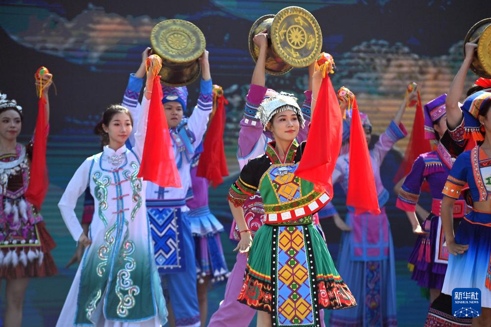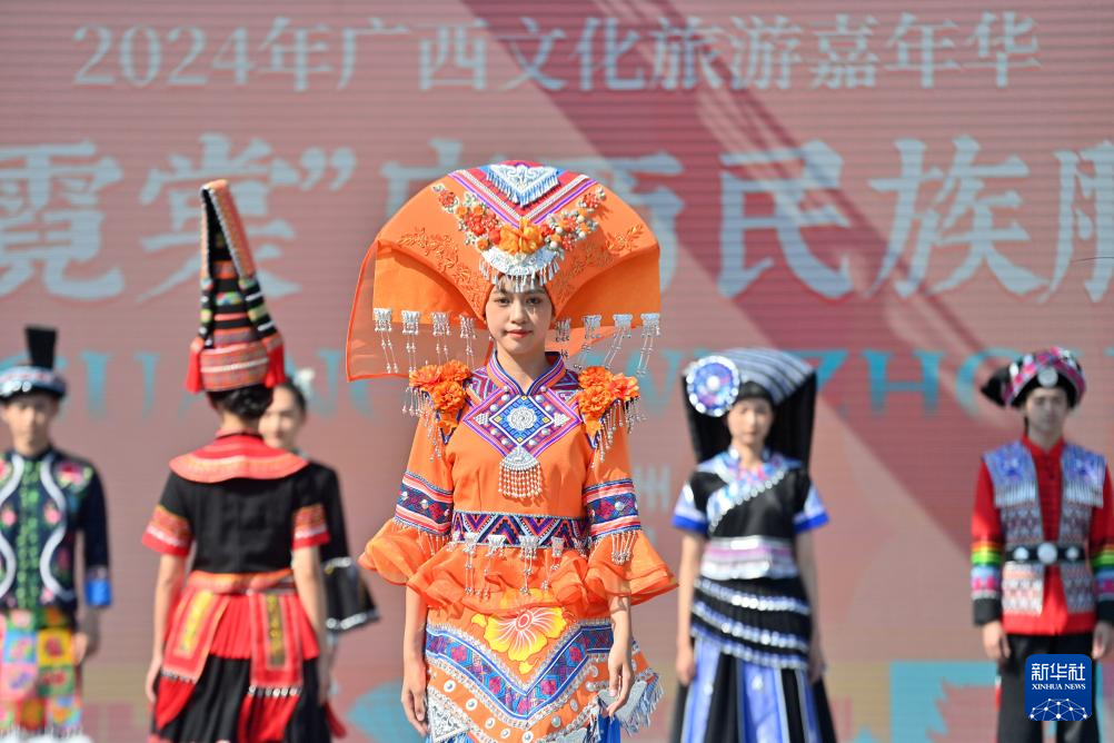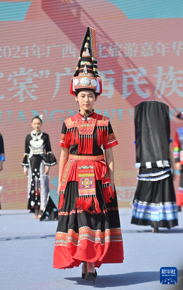 11月12日,在梧州市政广场,模特在展示民族服饰。