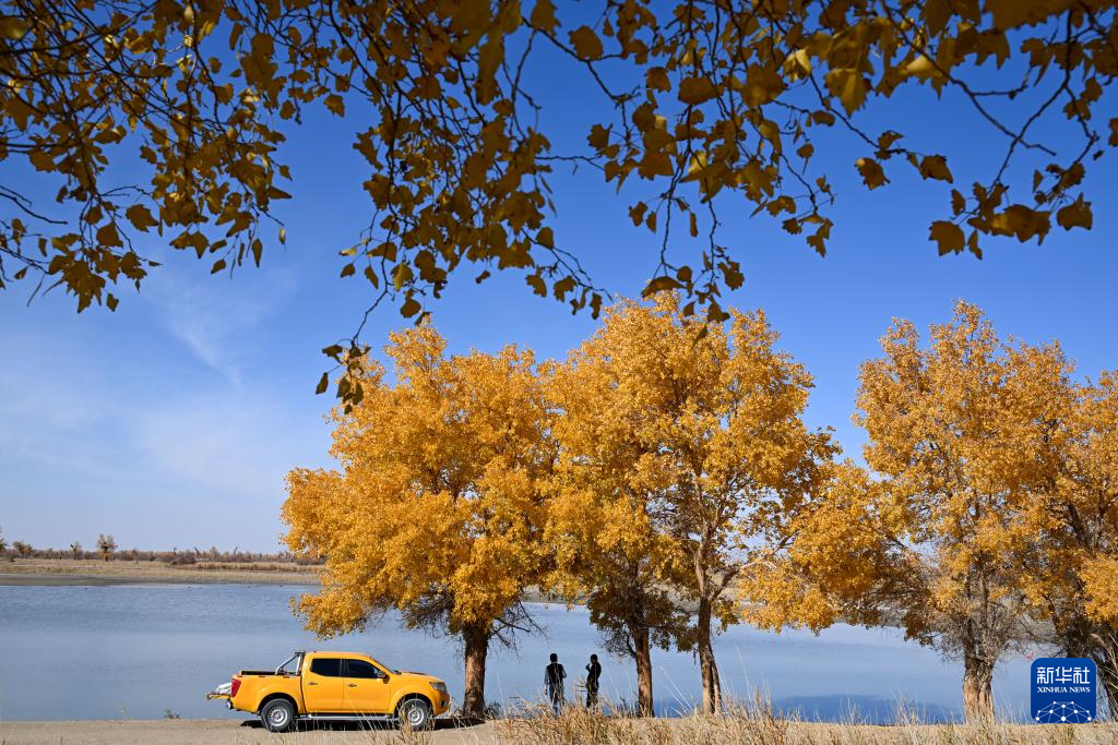 人们在新疆于田县达里雅布依旧址景区内克里雅河畔胡杨树下休息(2024年11月5日摄)。