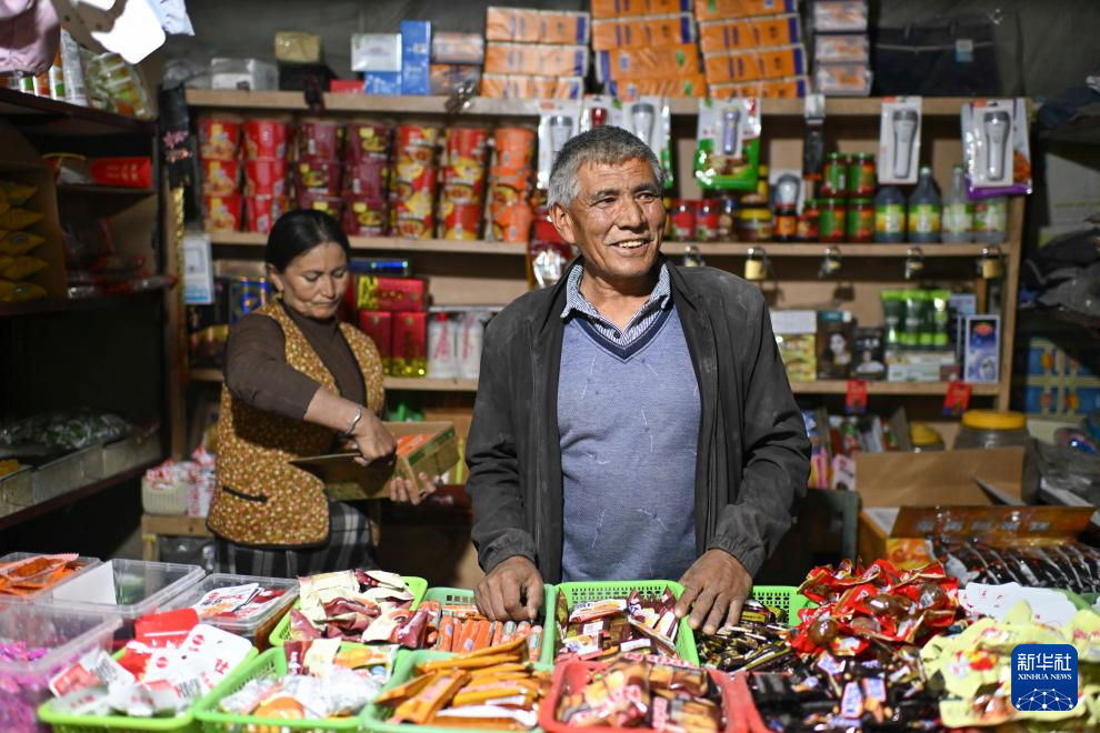 57岁的村民艾尼瓦尔·买提斯地克(右)和妻子一起在新疆于田县达里雅布依旧址景区经营一家小商店(2024年11月5日摄)。