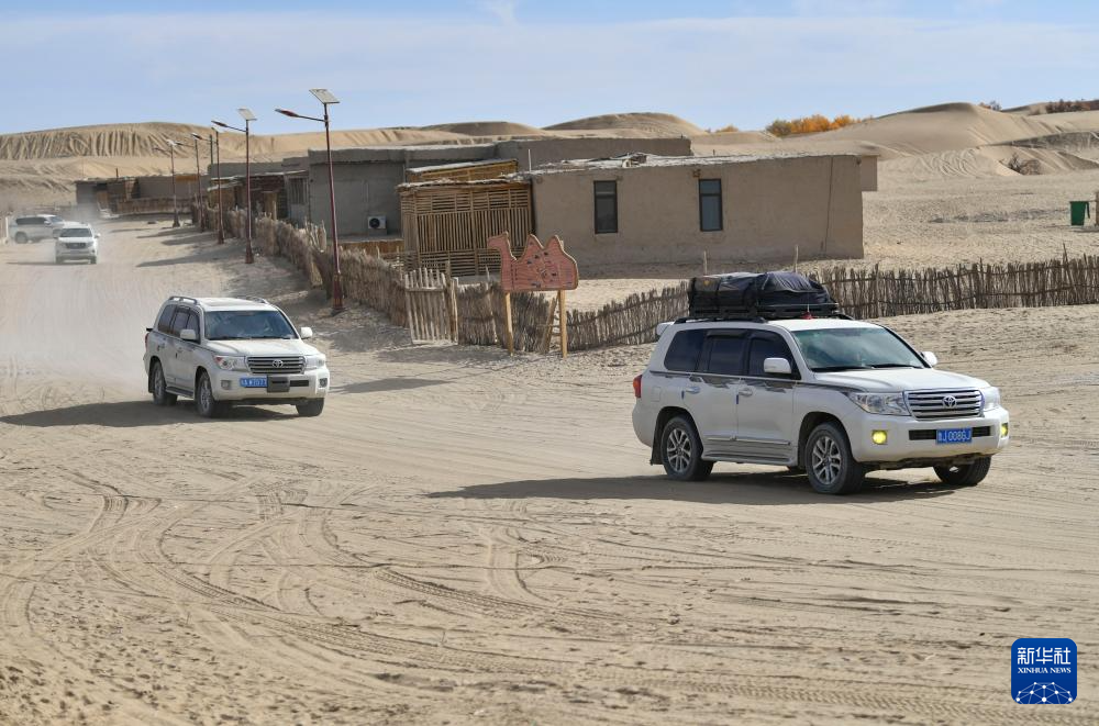 自驾游客开车行驶在新疆于田县达里雅布依旧址景区(2024年11月6日摄)。