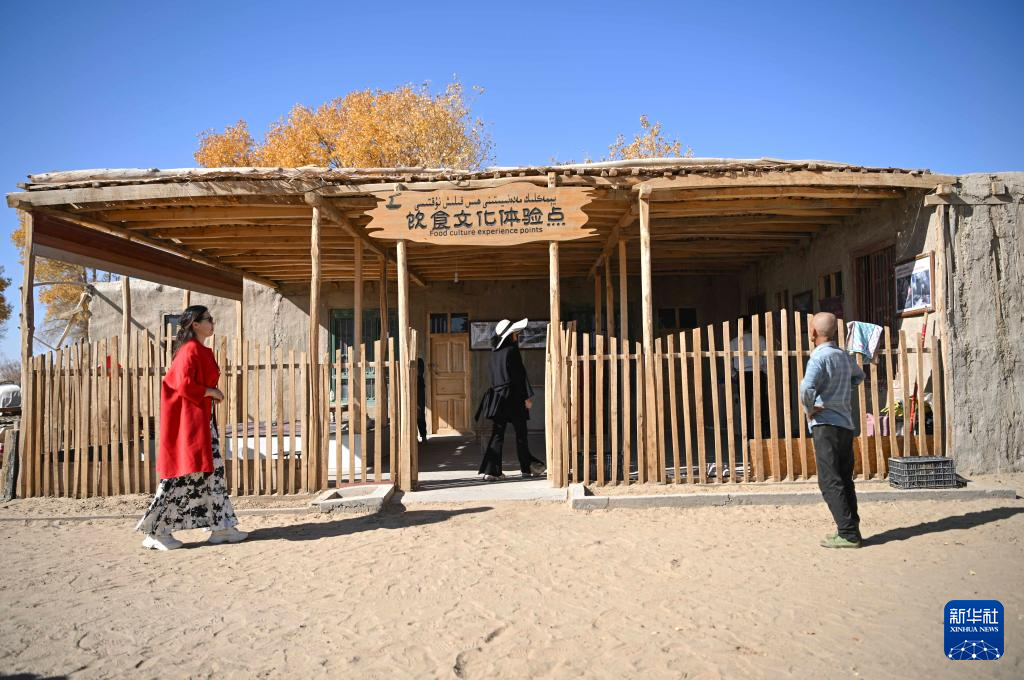 在新疆于田县达里雅布依旧址景区,游客来到61岁村民托合提·依明(右)的老房子参观(2024年11月7日摄)。