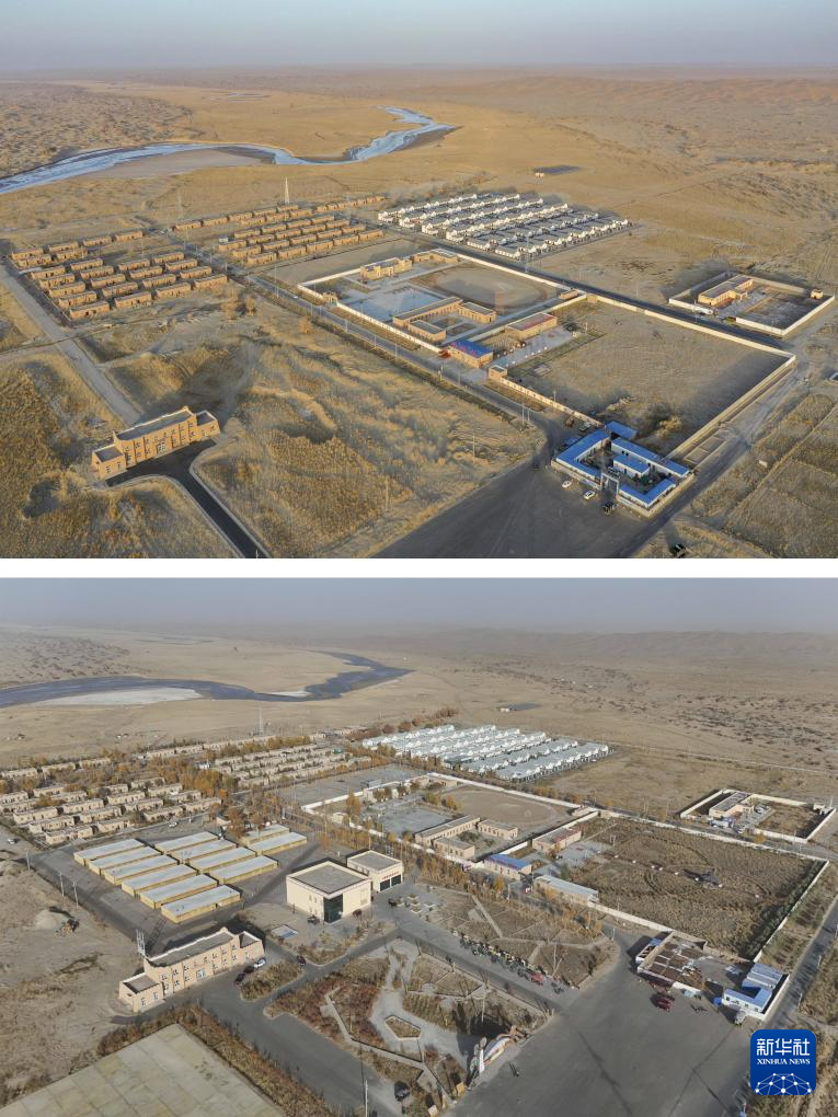 拼版照片:上图为2019年11月19日拍摄的于田县达里雅布依新村(无人机照片);下图为2024年11月9日拍摄的于田县达里雅布依新村,新增的建筑为游客服务中心、停车场等(无人机照片)。