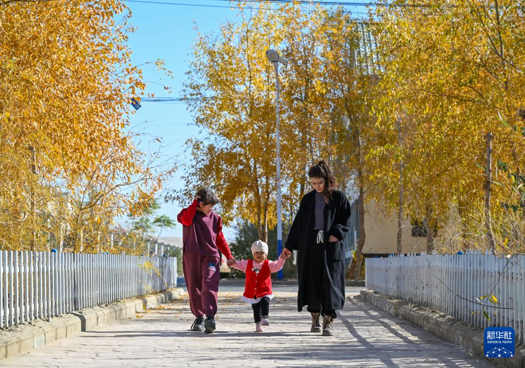 在新疆于田县达里雅布依新村,家长带着孩子在街道上散步(2024年11月9日摄)。