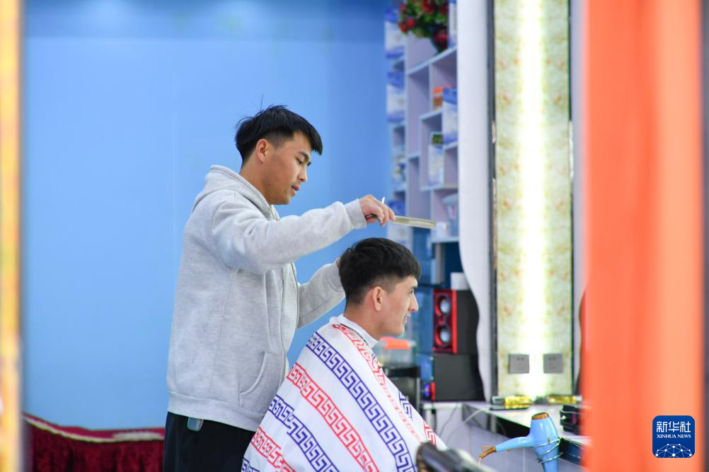 在新疆于田县城的一家理发店,身为老板的达里雅布依村村民买买提·巴拉提(左)为顾客理发(2024年11月11日摄)。买买提2019年从于田县职业高中毕业,他先从学徒做起,2021年开始经营这家店。