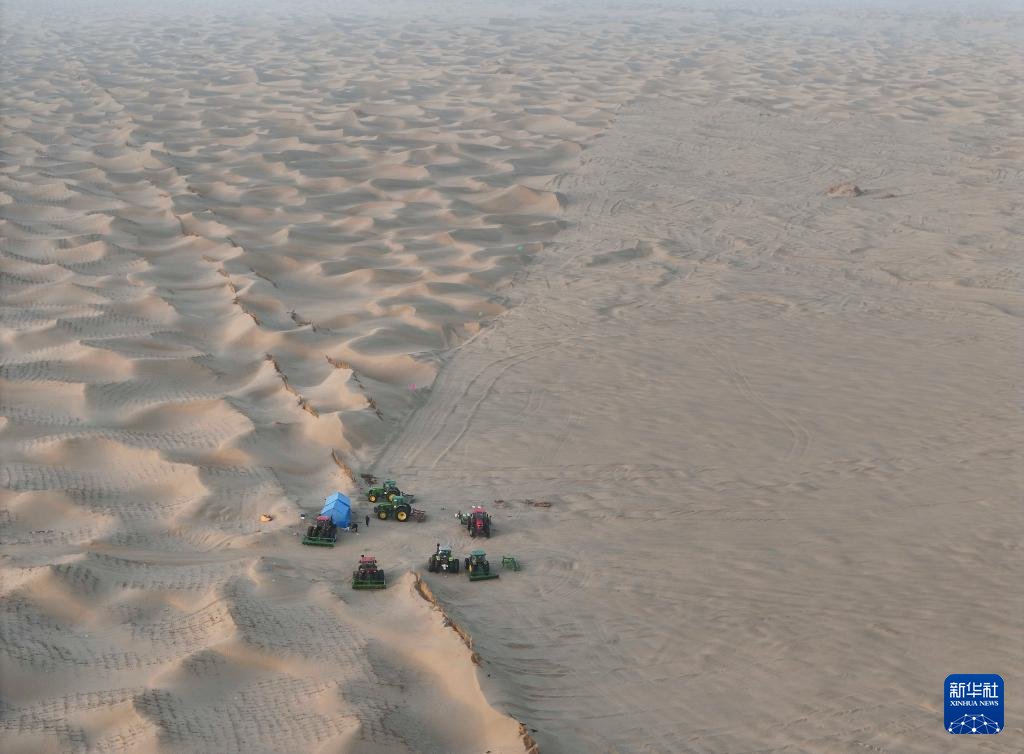 在新疆于田县达里雅布依新村附近,村民平整沙地,扩大肉苁蓉种植面积(2024年11月9日摄,无人机照片)。