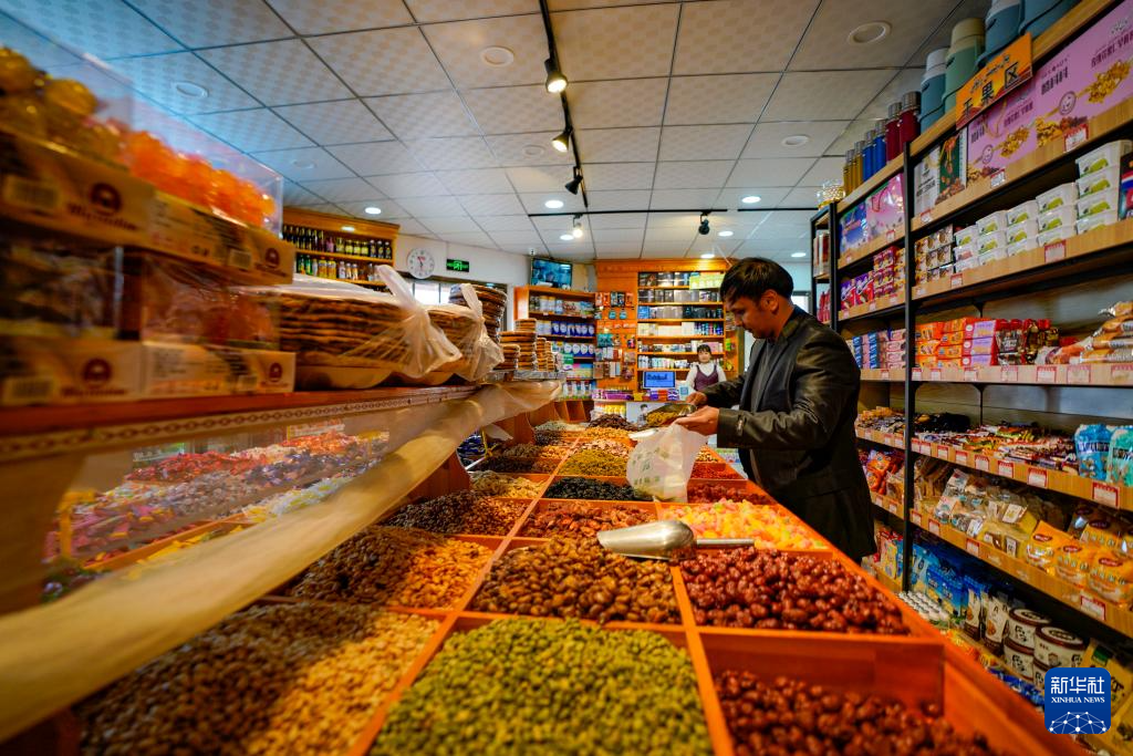 在新疆于田县城,达里雅布依村民吾不力卡司木·买吐送在超市内为顾客盛装干果(2024年11月11日摄)。2021年起,他在县城开了一家超市。