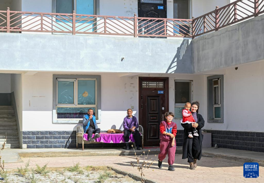 在新疆于田县达里雅布依新村,一户人家从自家新房的院子里走出(2024年11月9日摄)。