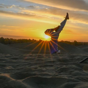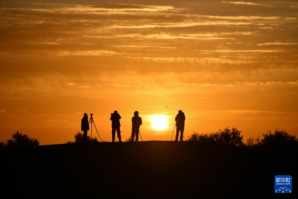清晨日出时,游客在新疆于田县达里雅布依旧址景区的沙山上拍照(2024年11月6日摄)。