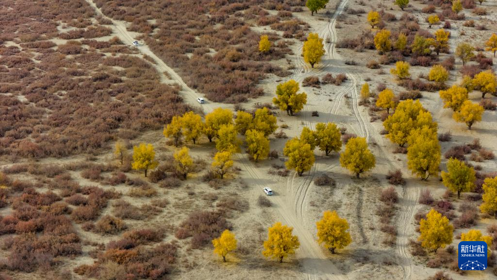 游客的自驾车队在新疆于田县达里雅布依旧址景区穿越胡杨林和红柳林(2024年11月6日摄,无人机照片)。