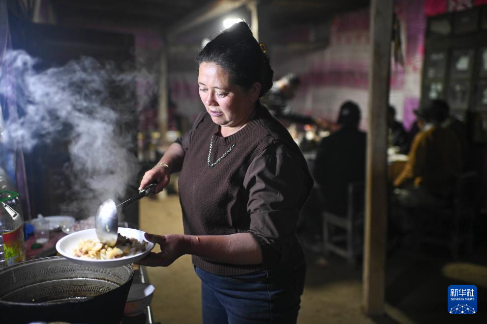 在新疆于田县达里雅布依旧址景区,村民艾西汗·如孜为夜间抵达的游客做饭(2024年11月6日摄)。搬迁后,她在2020年4月开了这家餐厅。