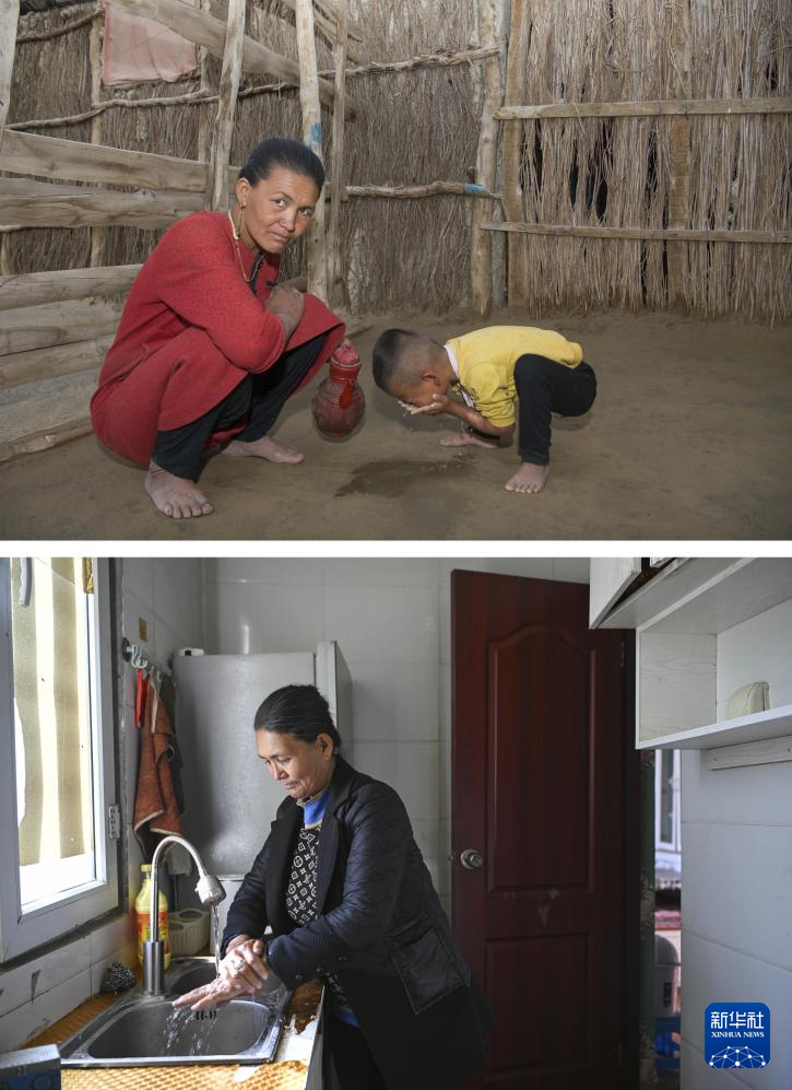 拼版照片:上图为搬迁前,达里雅布依村村民库尔班罕·麦麦提热依木给小孙子倒水洗脸(2018年9月6日摄);下图为库尔班罕在新村家中洗手(2024年11月7日摄)。
