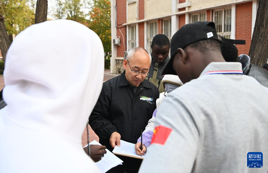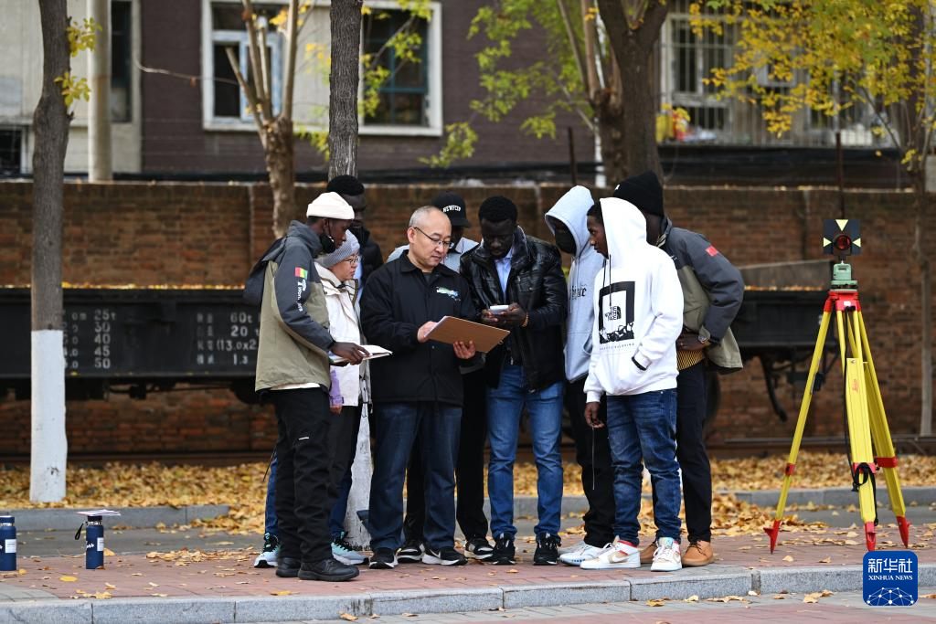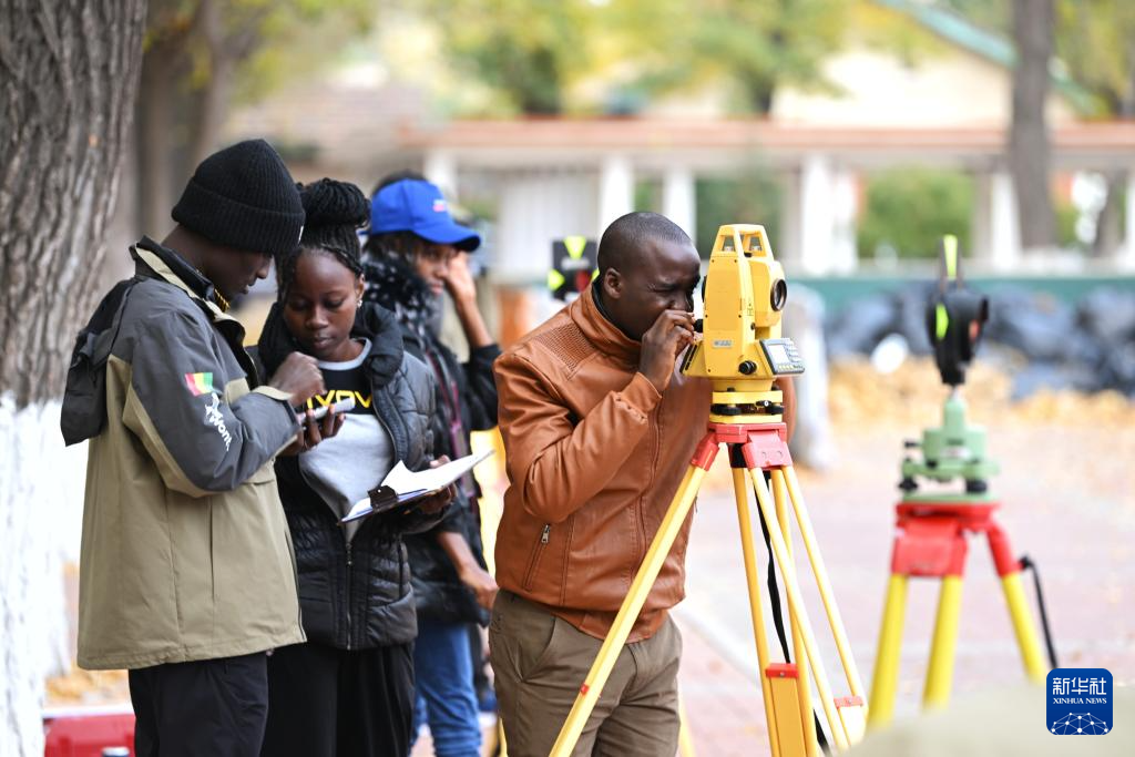 来自几内亚的学员在天津铁道职业技术学院学习使用测距仪器(11月11日摄)。
