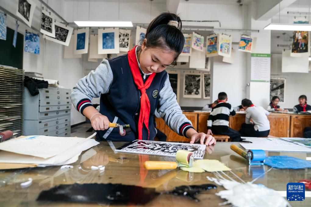 11月12日,曲靖市第二小学的学生在创作当地特色的爨文化版画作品。
