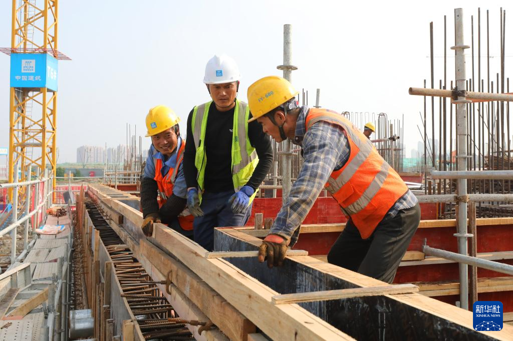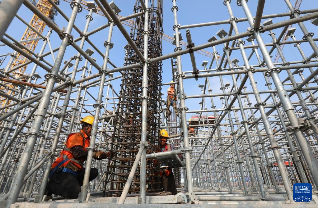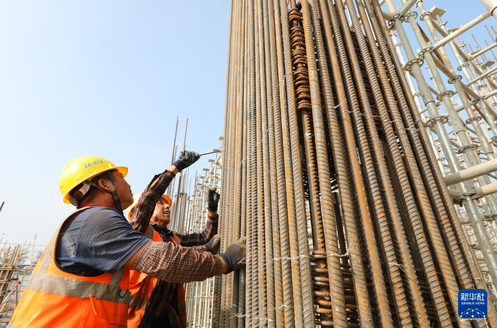 工人在复旦大学附属中山医院青浦新城院区一期工程建设项目施工现场进行钢筋绑扎作业(11月13日摄)。