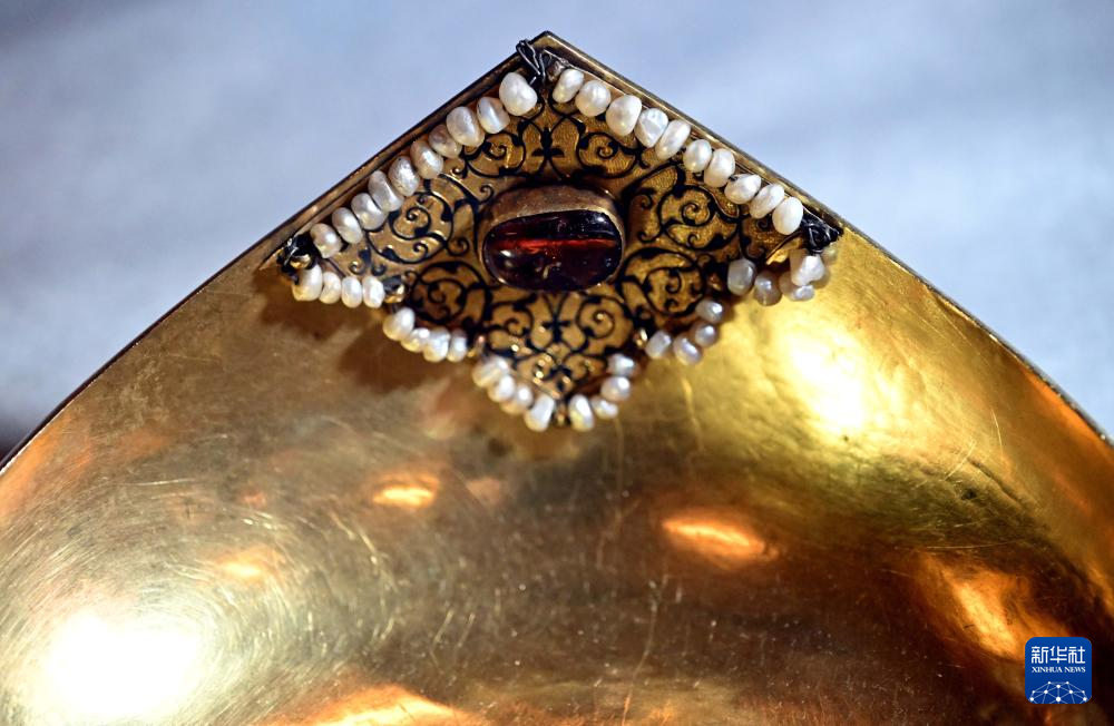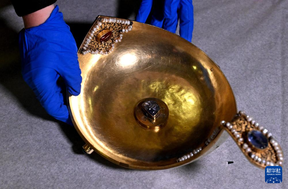 这是即将展出的船形杯局部(11月13日摄)。船形杯是古代俄罗斯最具特色的容器之一。在宴会上,船形杯被用来盛放最受欢迎的俄罗斯饮料——蜂蜜或蜂蜜酒。