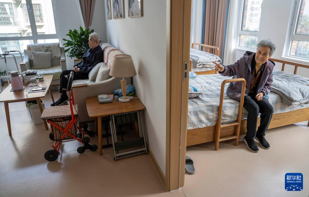 11月11日,在日照市的山东港福(日照)颐养中心,一对老夫妻在他们居住的套间内休息,该套间外面为客厅,里面为卧室。