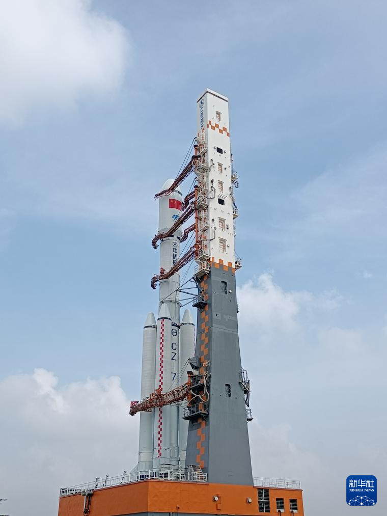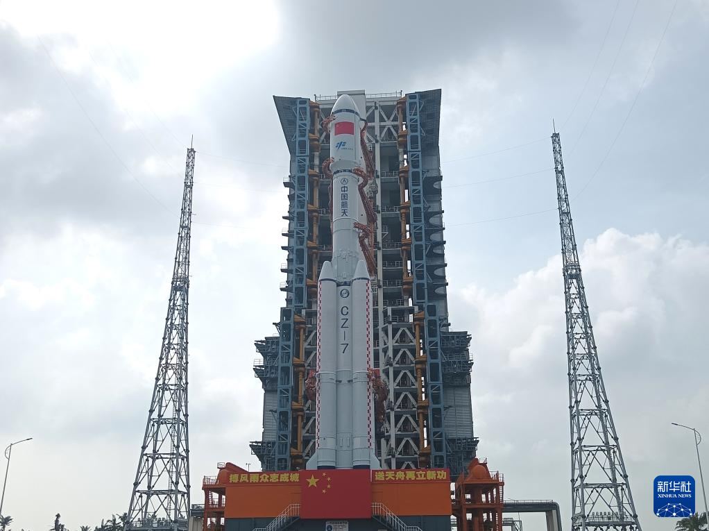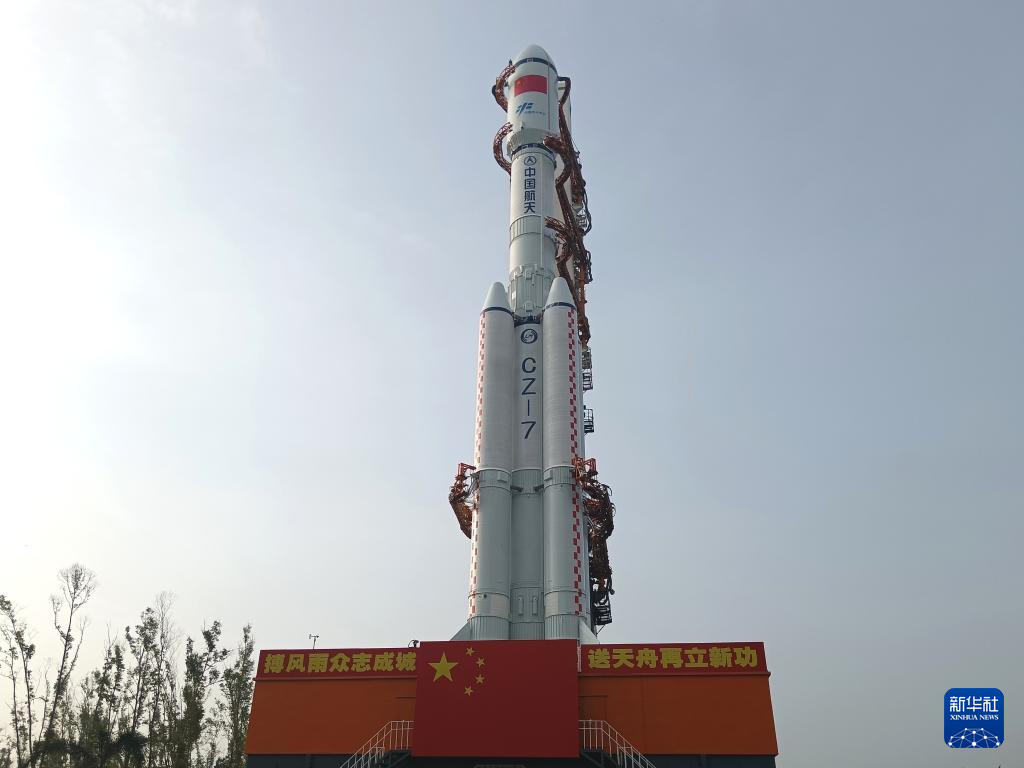 当日,天舟八号货运飞船与长征七号遥九运载火箭组合体垂直转运至发射区,将于近日择机发射。