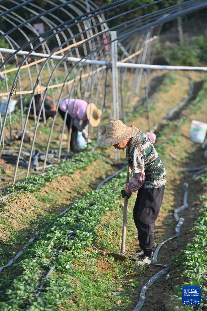 11月13日,在梧州市长洲区倒水镇富万村,村民在草莓采摘体验园种植草莓。