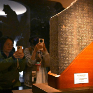 11月14日,观众在上海博物馆东馆中国历代书法馆拍摄东汉时期的《熹平石经周易残石》。