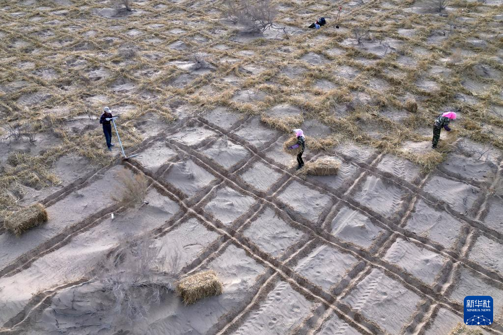 11月15日,在民勤县薛百镇境内,居民扎草方格沙障(无人机照片)。