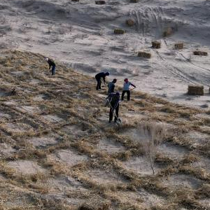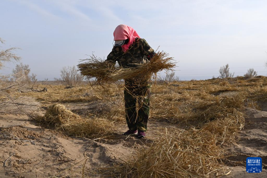 初冬时节,甘肃省武威市民勤县林业部门组织干部群众在沙漠边缘压沙治沙。民勤县地处巴丹吉林沙漠和腾格里沙漠之间,近年来,当地实施巴丹吉林沙漠南缘风沙阻击、腾格里沙漠西缘协同治理、绿洲外围沙地歼灭、林草湿荒资源管护利用“四大专项行动”,综合治理青土湖、西沙窝、老虎口等重点风沙口。