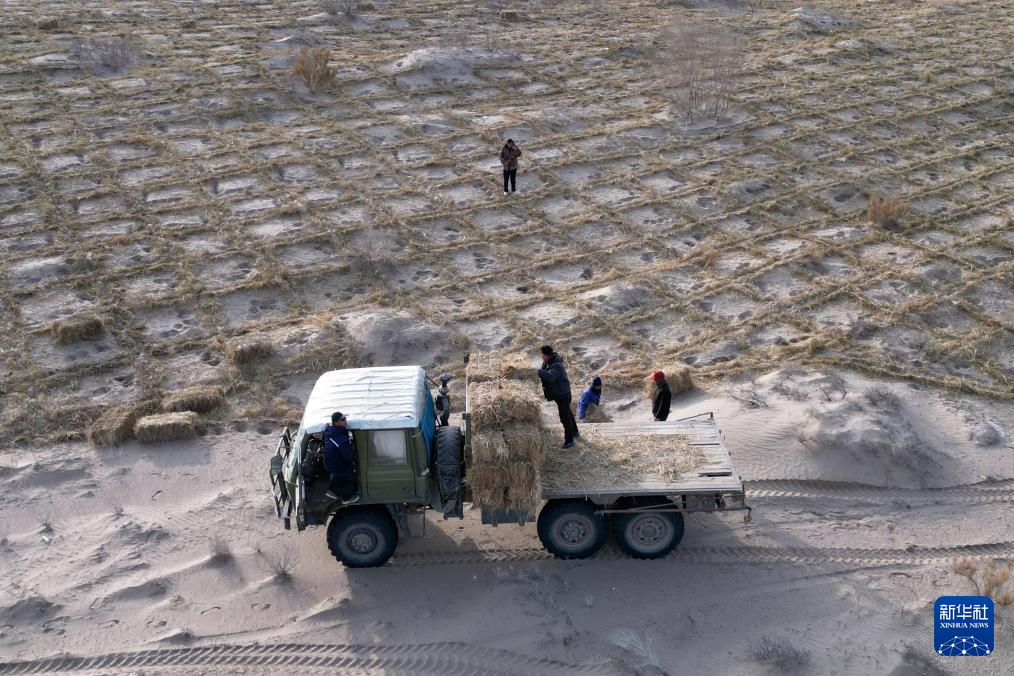 11月15日,在民勤县薛百镇境内,居民从车上卸下扎草方格用的稻草(无人机照片)。