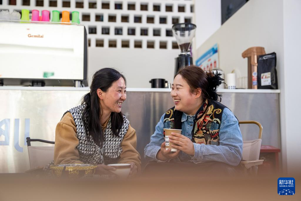 11月5日,在四川省甘孜藏族自治州巴塘县,刘莎莎在巴塘县社会力量发展中心集群与咖啡厅的负责人格秋曲珍聊天。