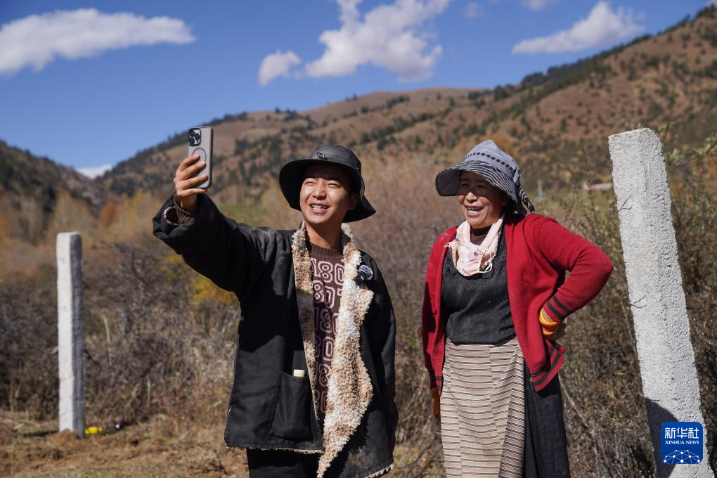 11月3日,在四川省甘孜藏族自治州理塘县甲洼镇,达洼(左)在和他的妈妈拍摄视频。