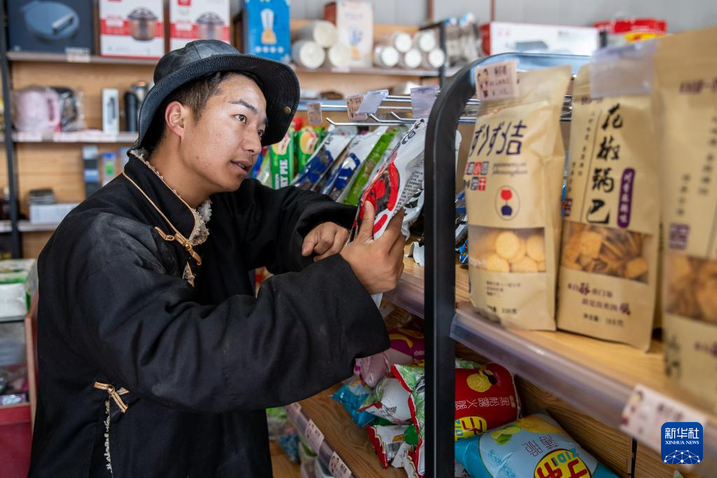 11月3日,在四川省甘孜藏族自治州理塘县甲洼镇,达洼在自家的超市整理商品。