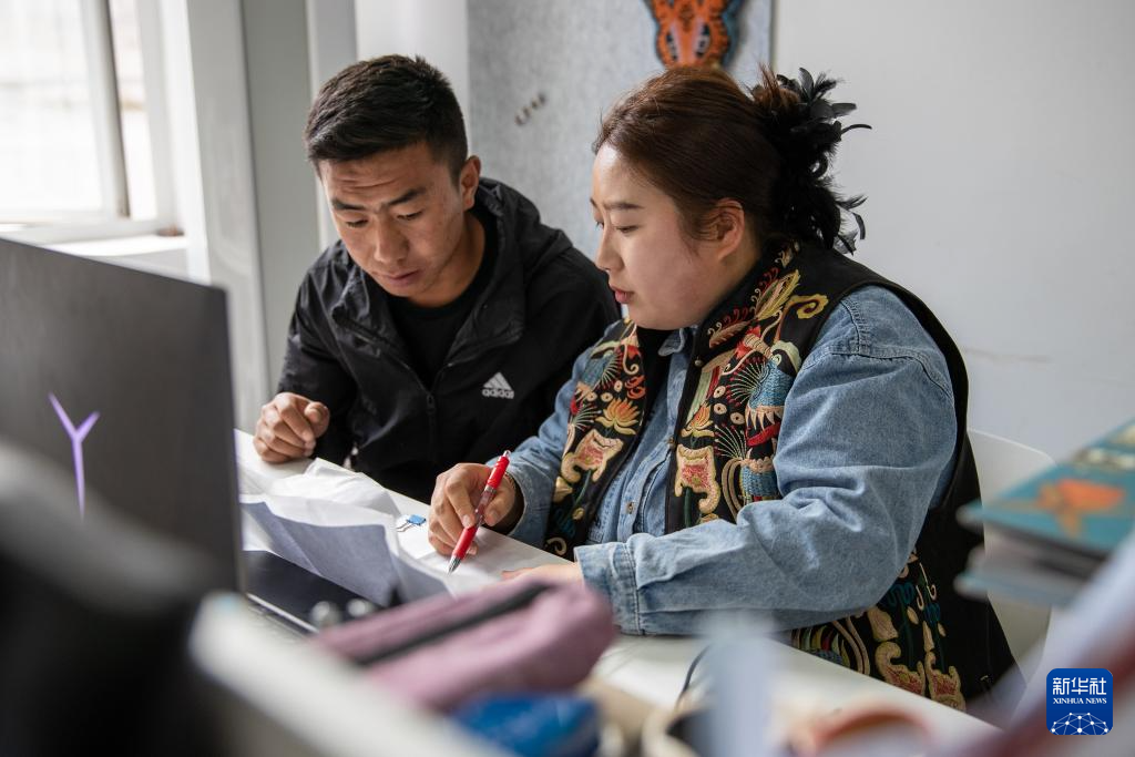11月5日,在四川省甘孜藏族自治州巴塘县,刘莎莎在巴塘县社会力量发展中心集群内的办公室与同事讨论工作。