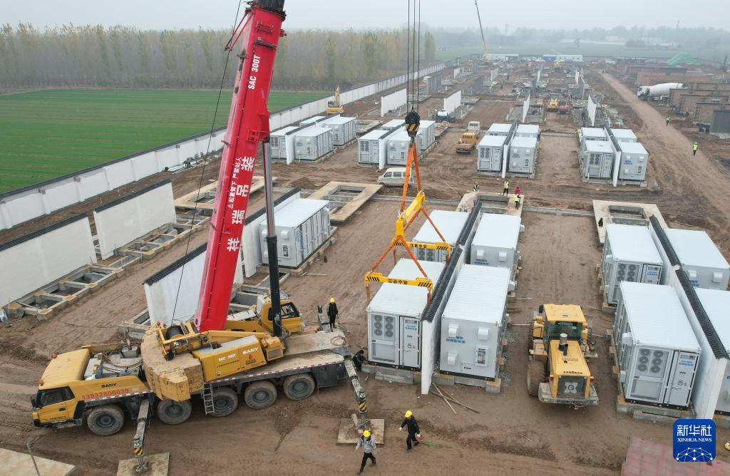 11月15日,工人在位于河北省衡水市武邑县武邑镇境内的百兆瓦级独立储能电站建设工地施工。
