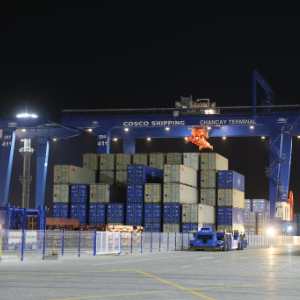 11月14日,在秘鲁首都利马以北的钱凯港,岸边智能化设备吊装集装箱。