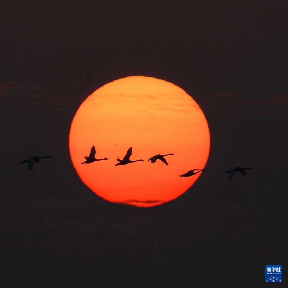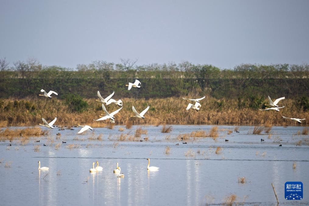 11月12日,小天鹅在上海崇明东滩鸟类国家级自然保护区飞翔。