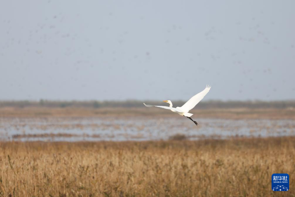 11月12日,大白鹭在上海崇明东滩鸟类国家级自然保护区飞翔。
