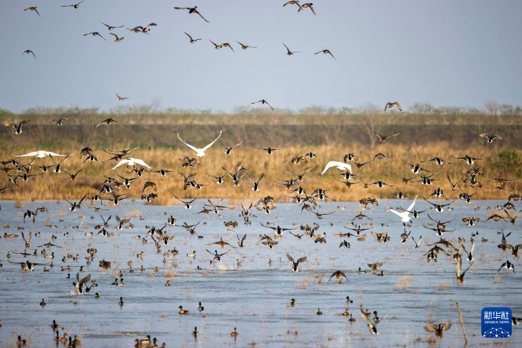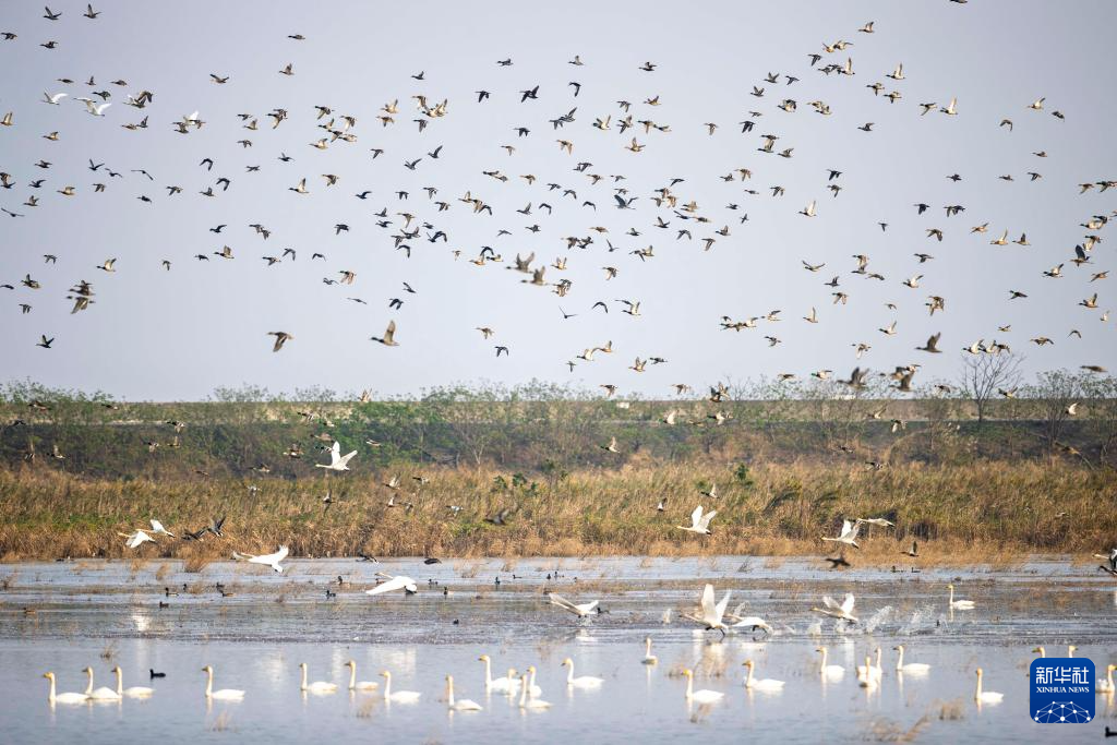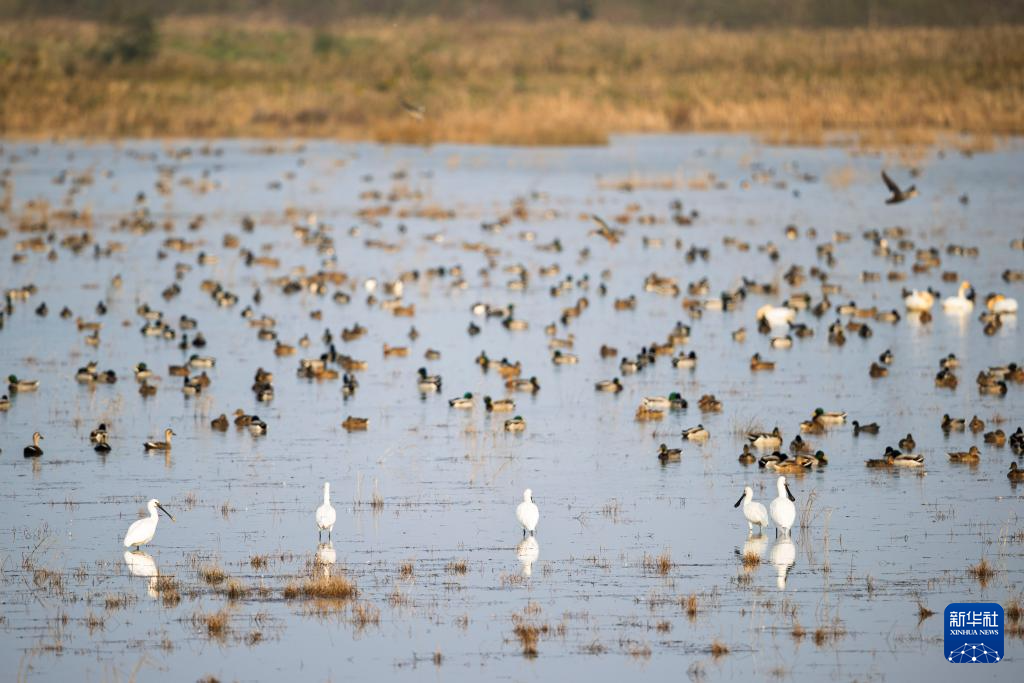 时值候鸟迁徙季,大批候鸟飞抵上海崇明东滩鸟类国家级自然保护区的湿地栖息,风景如画。