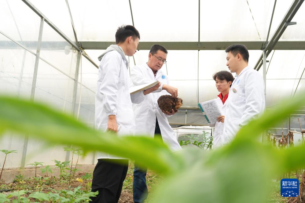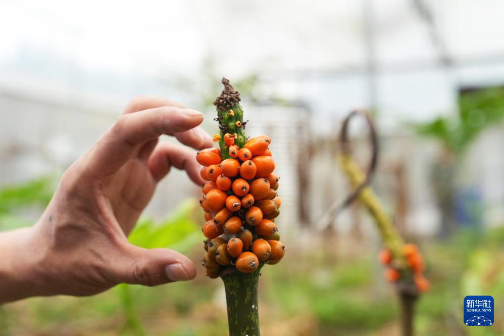 11月15日,在西南大学魔芋研究中心资源圃,科研人员查看人工杂交培育的魔芋种子成熟情况。
