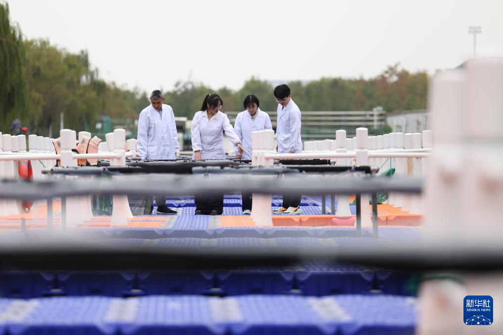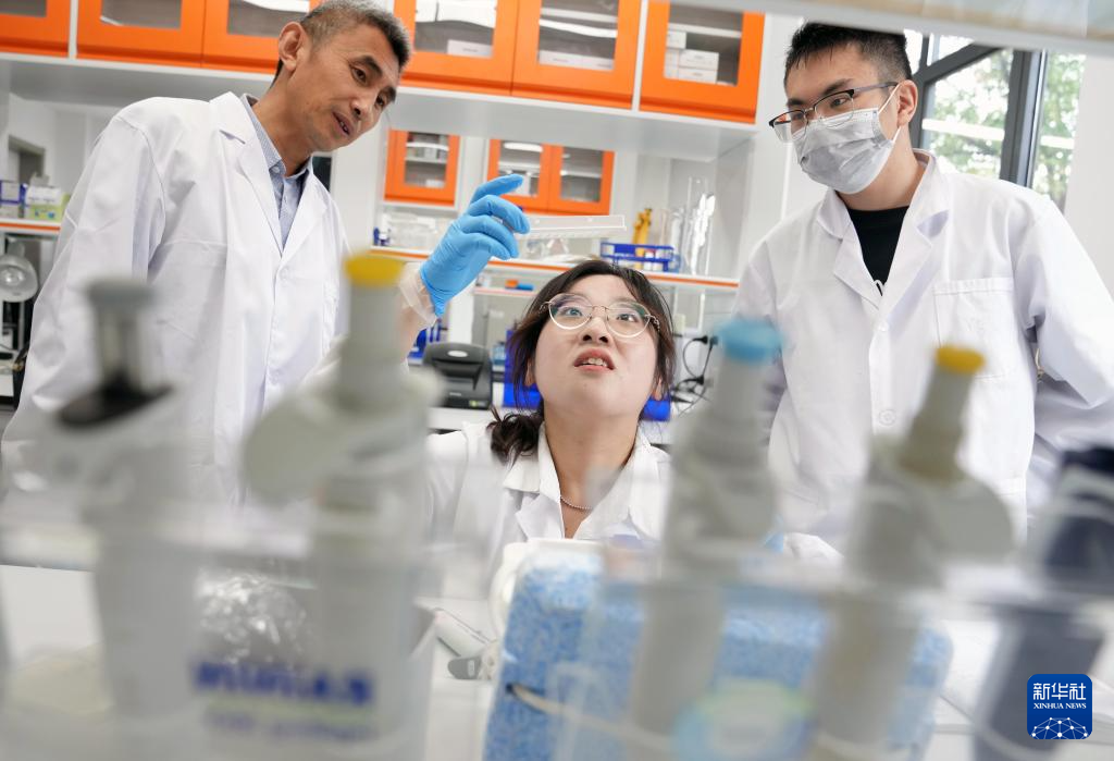 11月14日,在上海海洋大学的实验室内,白志毅教授(左)在指导王贺(中)等学生观察实验情况。