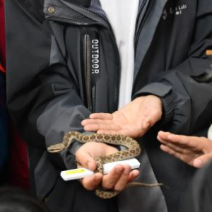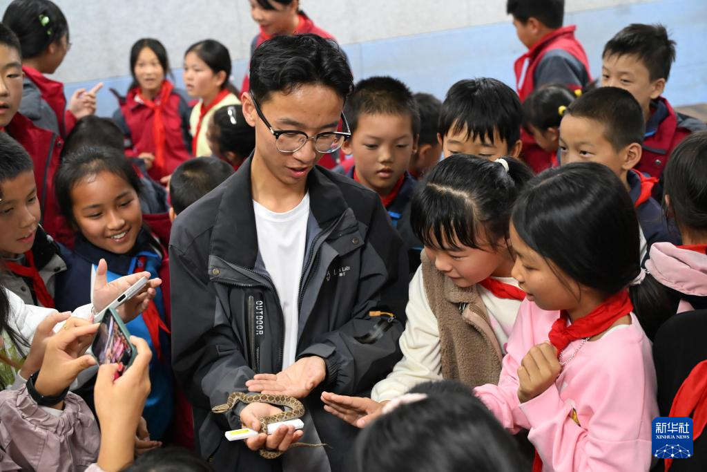 11月14日,科研人员周鑫龙在婺源县龙山学校公益自然科普课程中介绍蛇类知识。