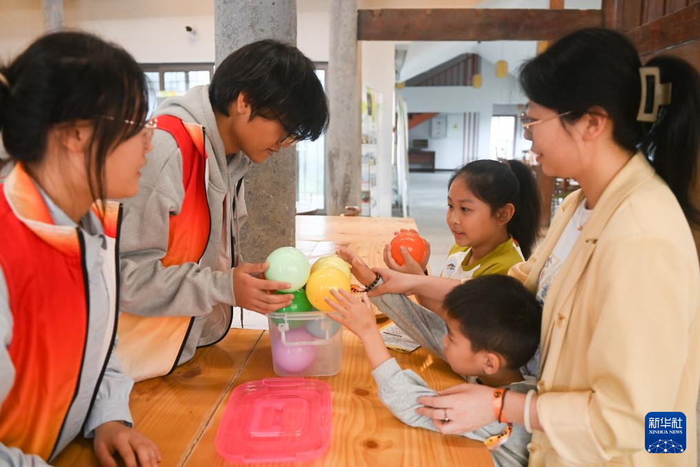 11月16日,青年志愿者在姚江镇山汀村青年旅舍协助亲子家庭完成知识问答。